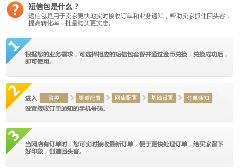 短信包是用于卖家更快地实时接收订单和业务通知,帮助卖家抓住回头客,提高转化率,批量购买更实惠!